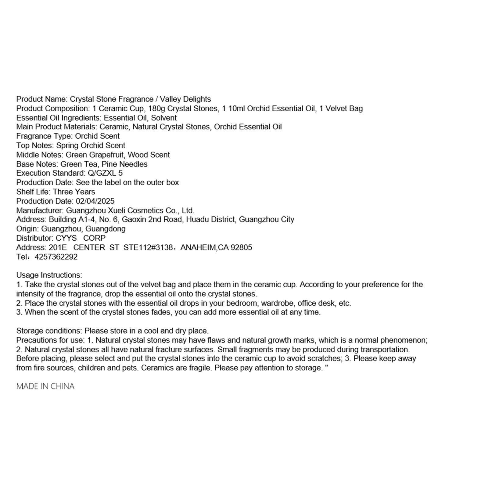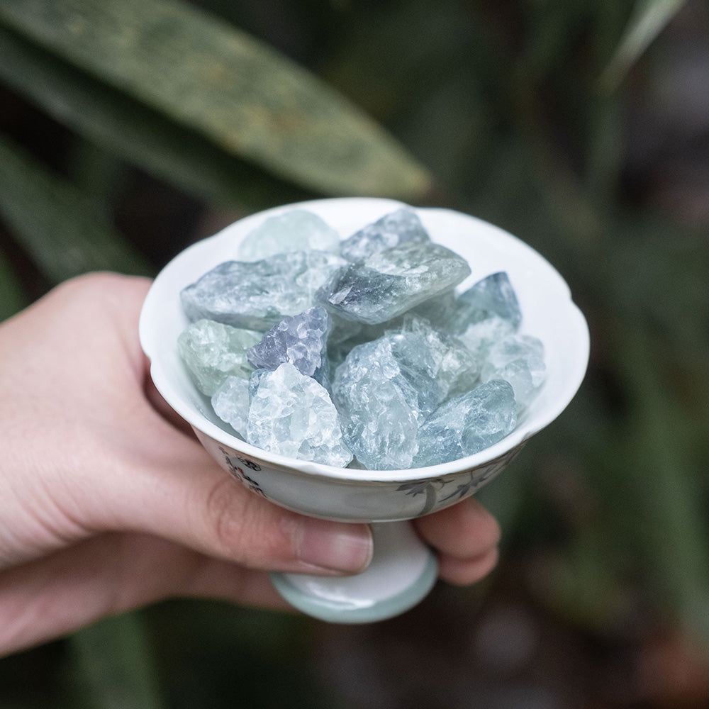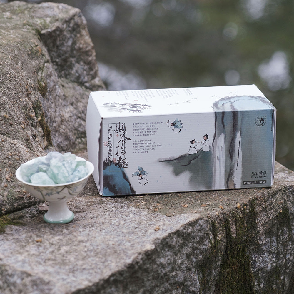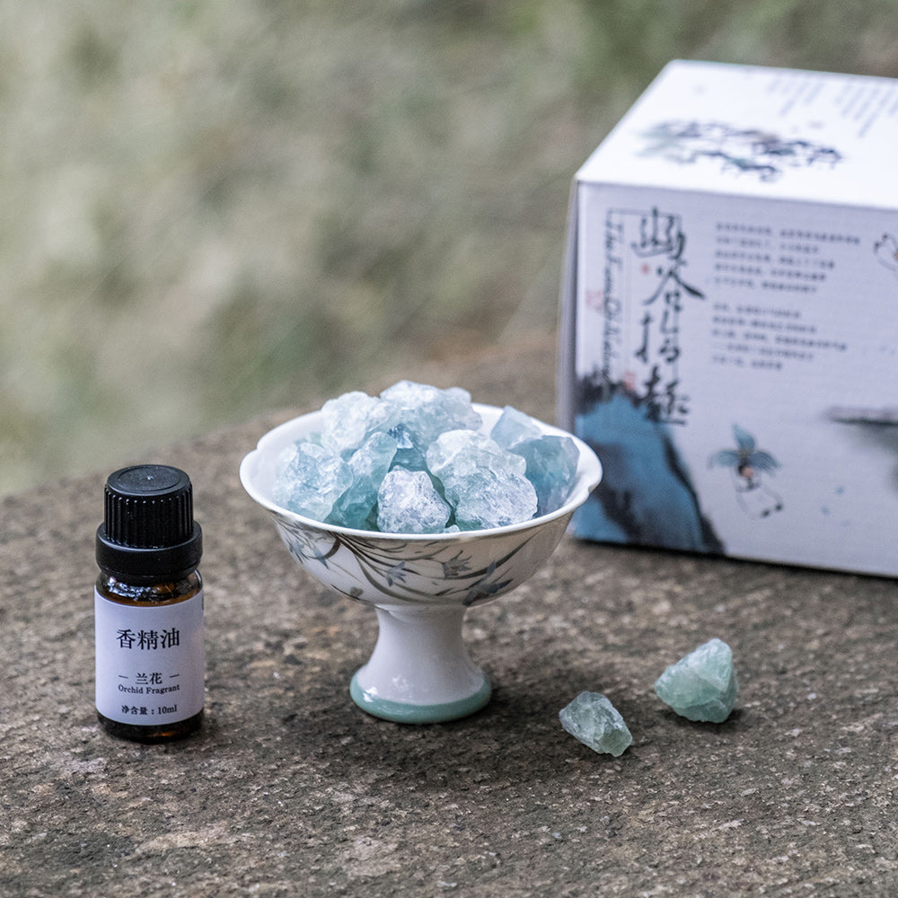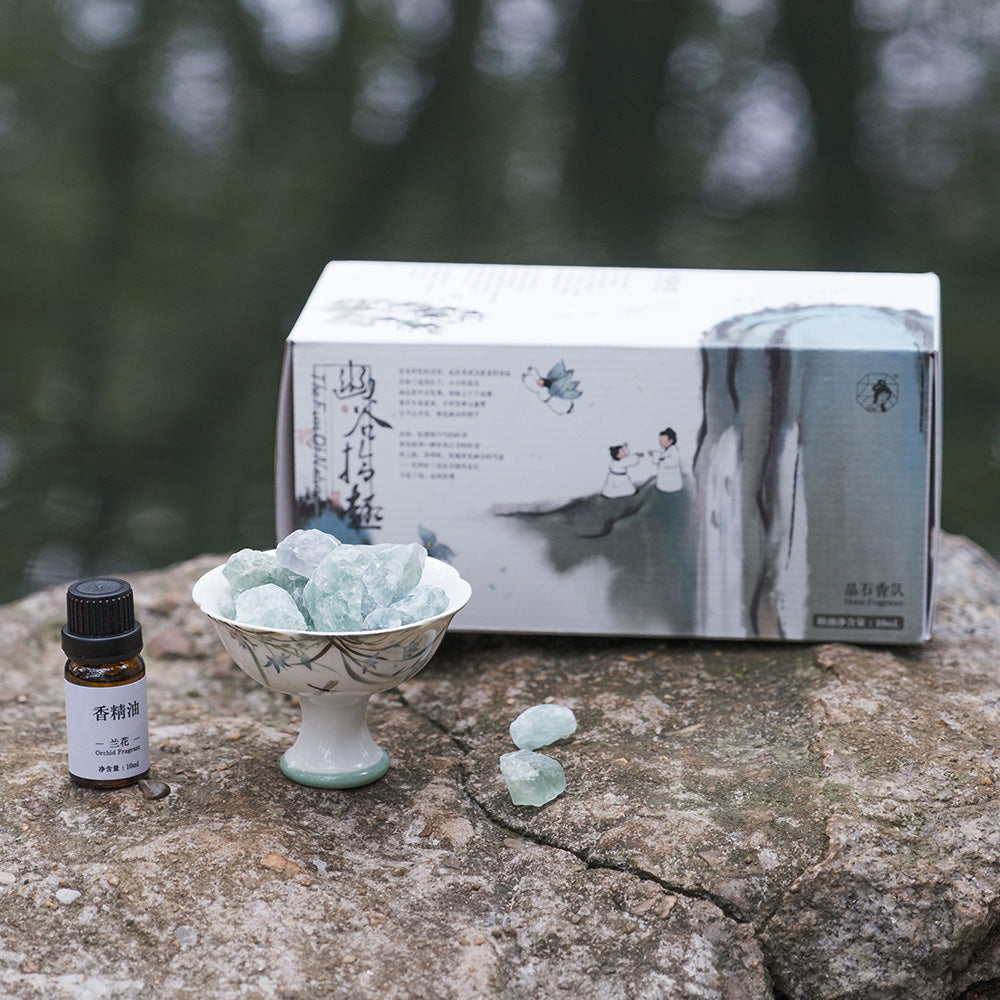 1 Chinese-style cup, 1 velvet pouch, 180g natural green fluorite stones, 10ml orchid essential oil.