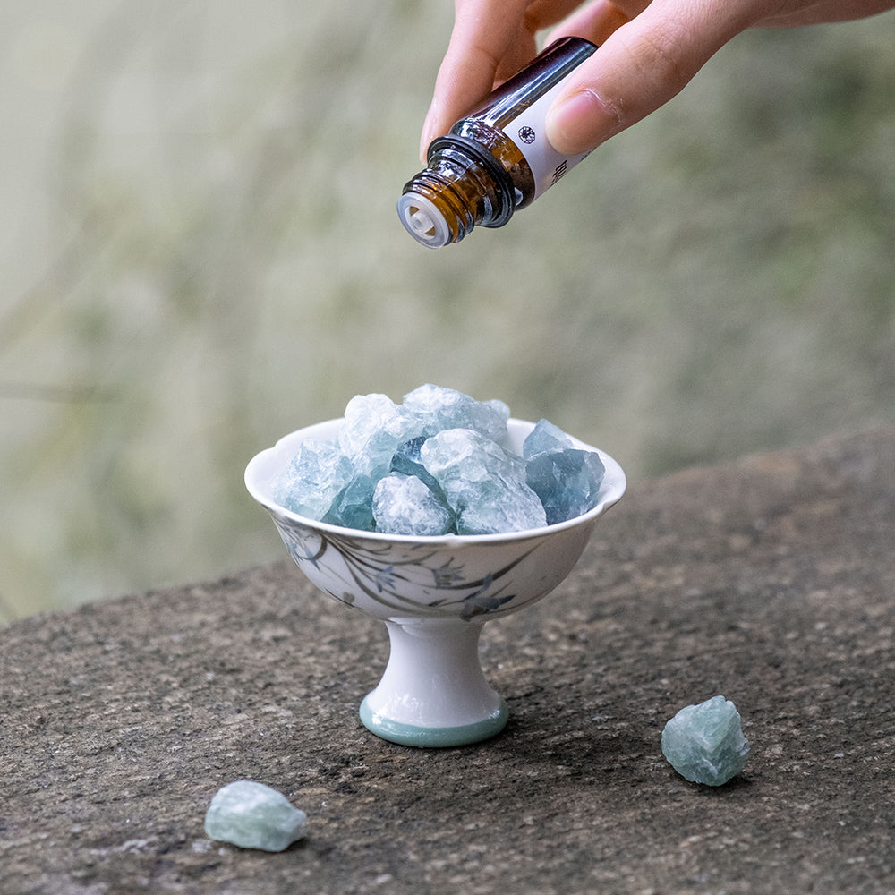aromatherapy set containing a classic Chinese tea cup and green crystal stones. Discover the Oriental aesthetics
