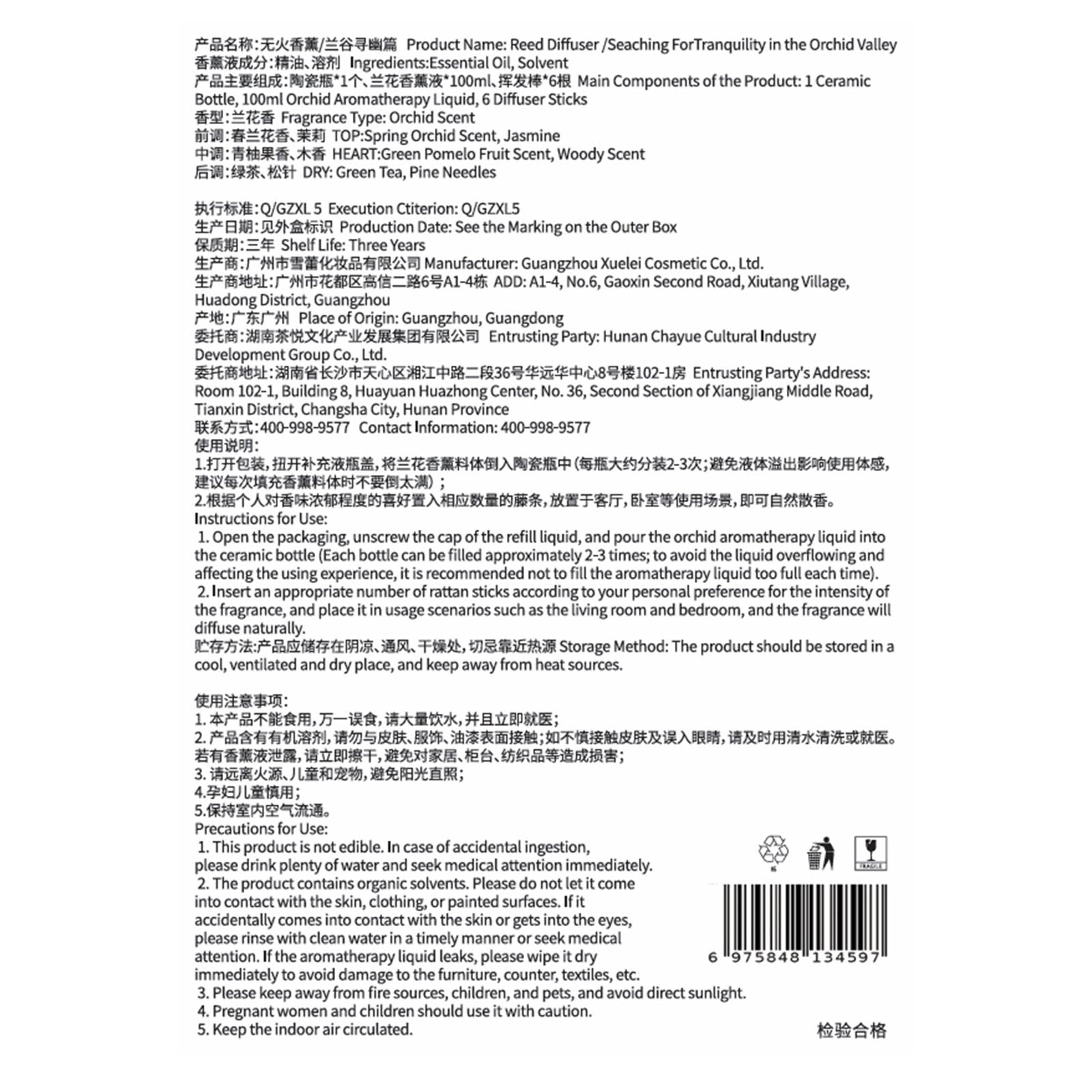 1 ceramic bottle, 6 reed sticks, 100ml fragrance liquid.