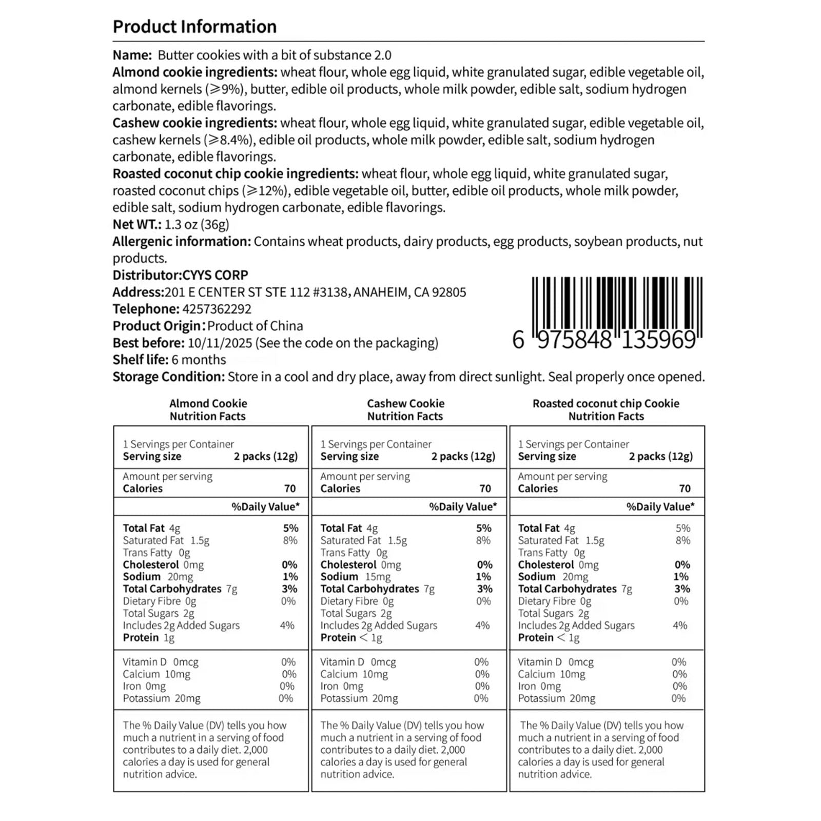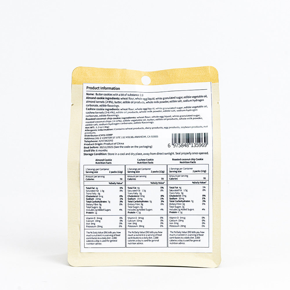 Each pack includes three flavors - almonds, cashews, and roasted coconut. Sweet and crisp taste, great for sweet cookie lovers.