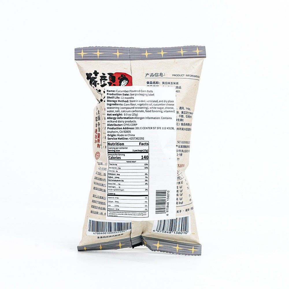 Made with Organic corn and top level cheese. Mixed cucumber flavor with cheese. Delicious snack!